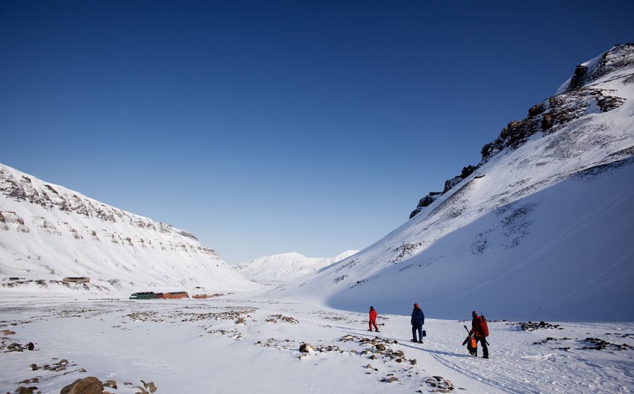 A group of people walking along a path outside Longyearbyen, Spitsbergen, Svalbard, Norway. (Credit: Canva)
