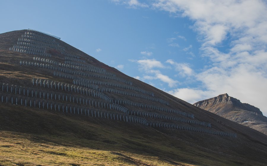 Snow fences installed in recent years on Mt. Sukkertoppen to help prevent new avalanches. In 2015, an avalanche plummeted down Mount Sukkertoppen, which overlooks the main settlement of Longyearbyen.(Credit: Larissa Thelin)