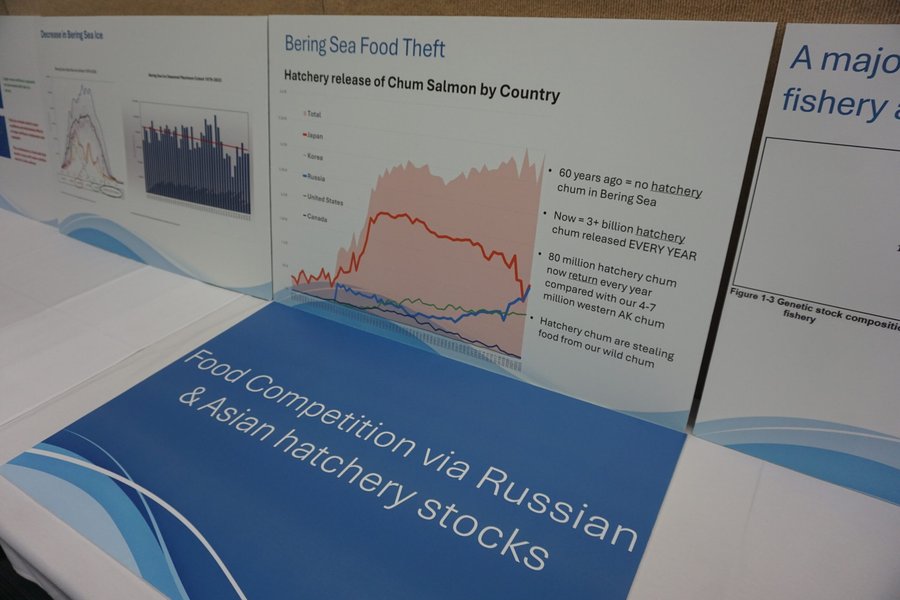 A poster explaining the increasing abundance in the Bering Sea of Asian hatchery chum salmon is seen on Feb. 6, 2026, in a room reserved by Community Development Quota organizations involved in the pollock harvest. The CDQ qroups are owned by residents of dozens of rural Alaska and Indigenous villages. In the room they reserved at the Egan Center, near to the larger space being used by the North Pacific Fishery Management Council for that group’s February meeting, the CDQ groups displayed several posters describing the roles that climate change and harchery fish are playing in Alaska salmon problems. (Photo by Yereth Rosen/Alaska Beacon)