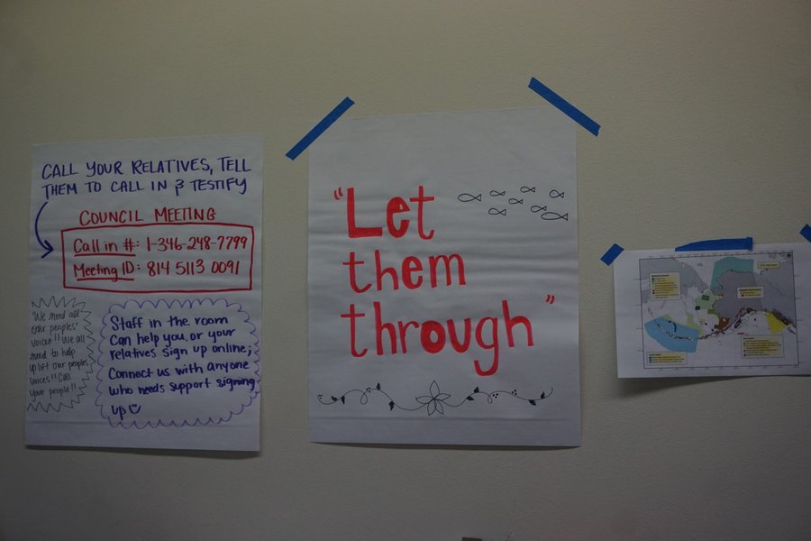 Signs seen Feb. 7, 2026, at a room in the William A. Egan Civic and Convention Center used by tribal organizations attending the North Pacific Fishery Management Council meeting. (Photo by Yereth Rosen/Alaska Beacon)