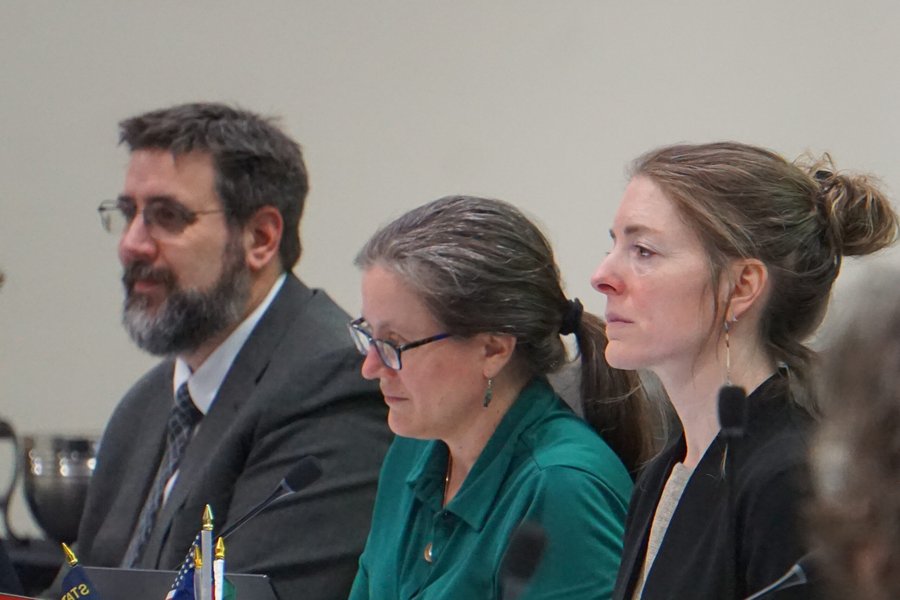 North Pacific Fishery Management Council member Nate Pamplin, Diana Evans, the council’s executive director, and council chair Angel Drobnica listen to testimony on Feb. 7, 2026, at the February meeting in Anchorage. (Photo byYereth Rosen/Alaska Beacon)