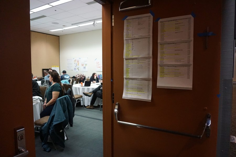 A list of people signed up to testify at the February meeting of the North Pacific Fishery Management Council is taped to a William A. Egan Civic and Convention Center room door on Feb. 9, 2026, The room, down the hall from the rooms where the council was convened, was reserved and used for the duration of the meeting by tribal oroganizations, including the Kuskokwim River Inter-Tribal Fish Commission and the Tanana Chiefs Conference. (Photo by Yereth Rosen/Alaska Beacon)