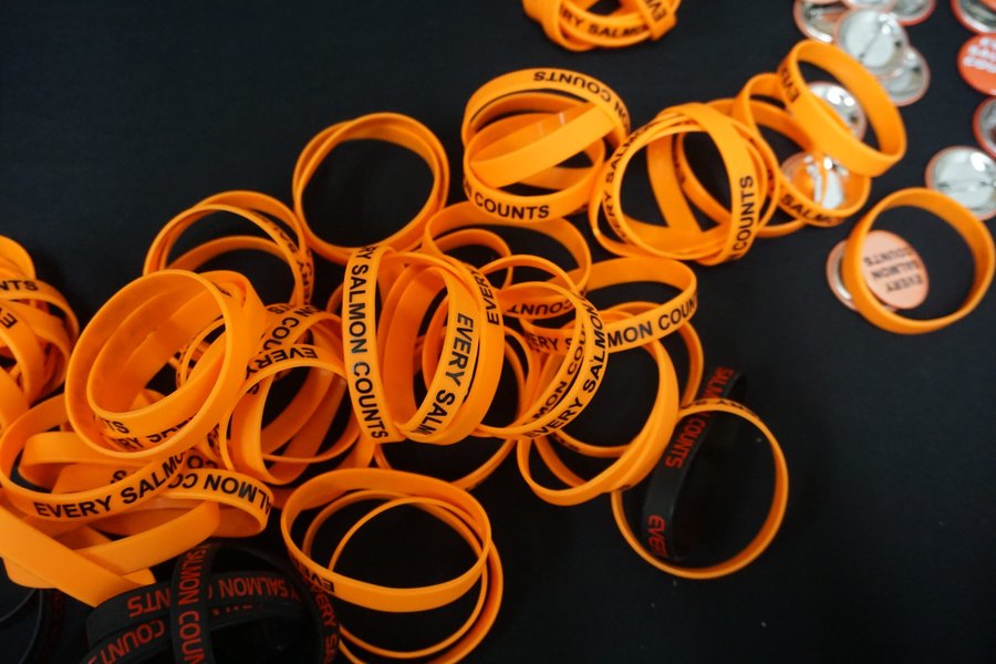 Wristbands and buttons bearing the slogan “EVERY SALMON COUNTS” are displayed on a table on Feb. 9, 2026. The wristbands and buttons were being distributed by tribal organizations attenting the North Pacific Fishery Management Council meeting in Anchorage. The slogan references the argument that every salmon that avoids bycatch and is able to swim to river spawning grounds is important to the population and to the people who depend on salmon runs. (Photo by Yereth Rosen/Alaska Beacon)