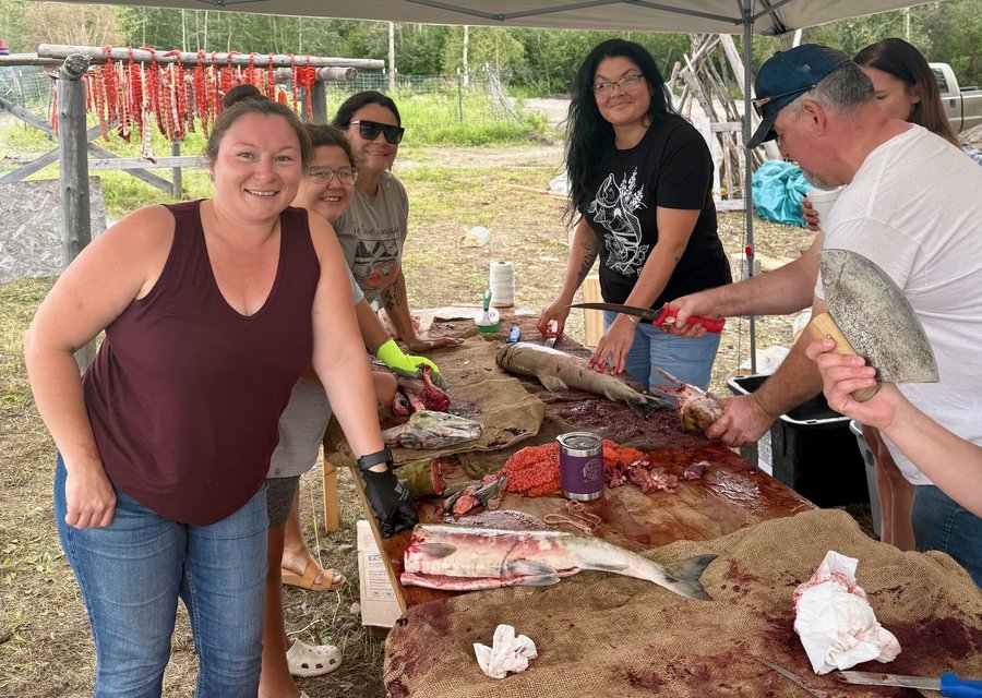 Eva Burk, Jessica and Rory Black, Ariella Bradley, Fatima Lord-Minano and Charlie Wright cut salmon during an August 2025 cultural camp held in Nenana. The youth and adults in the camp were able to harvest and process a few chum salmon in 2025, for the first time in several years. Burk, who is from Nenana, is a tribal representative on the North Pacific Fishery Management Council’s advisory panel. Wright is secretary and treasurer of the Tanana Chiefs Council. Both have argued for tighter restrictions on at-sea interception of Western Alaska chum salmon. (Photo provided by Eva Burk)